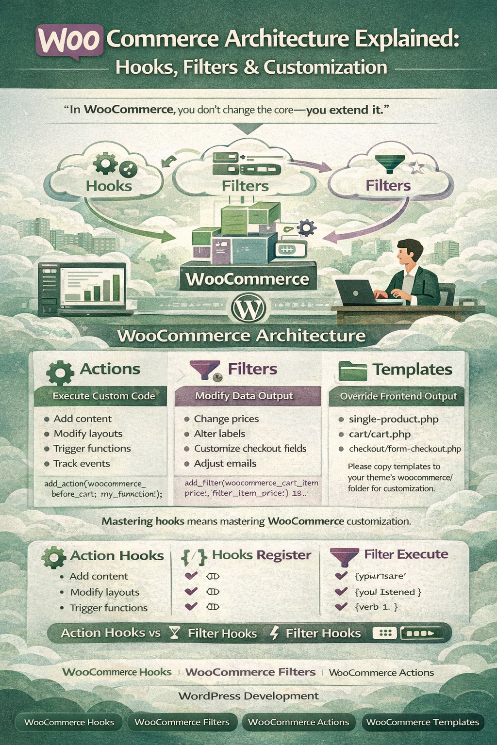 WooCommerce architecture is built around hooks, filters, templates, and data abstraction. Mastering WooCommerce hooks and WooCommerce architecture allows developers to customize behavior cleanly, safely, and efficiently.